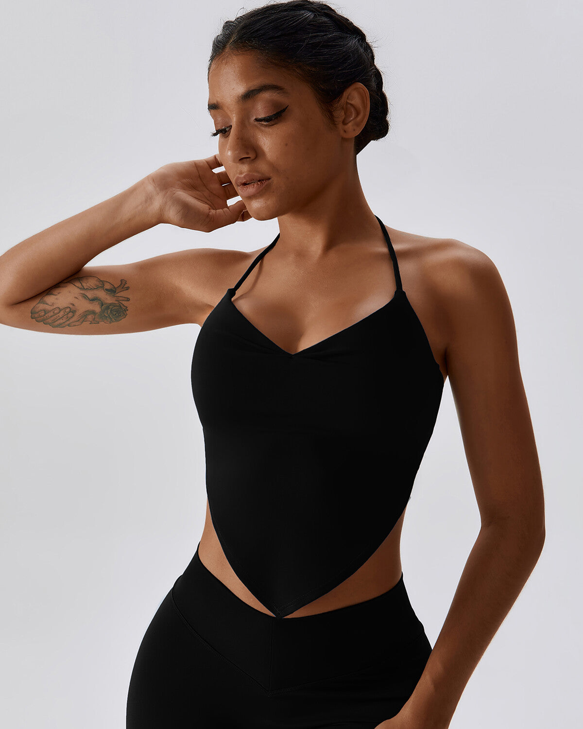 The tie neck, V-shaped neckline, and backless design radiate allure, complemented by the secure elasticated hem. Ideal for sports, yoga, and running, this tank top enhances your silhouette with an inverted triangle scarf hem and collarbone-accentuating halter neck.
