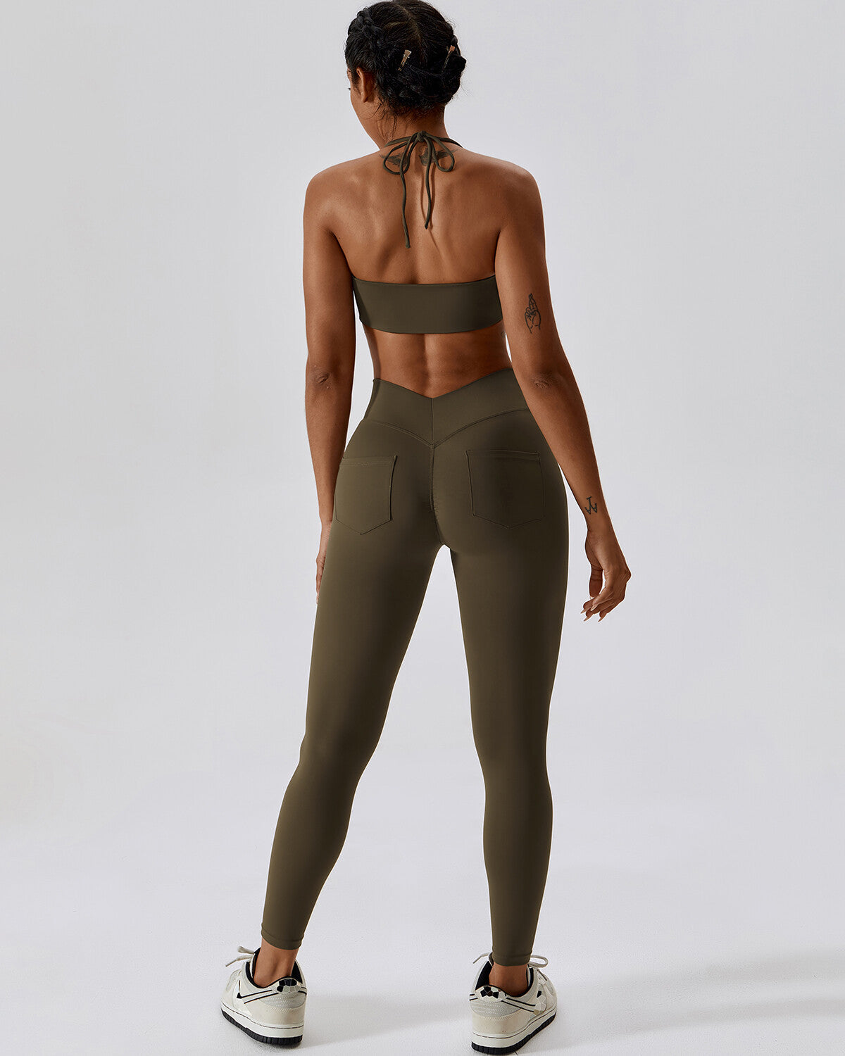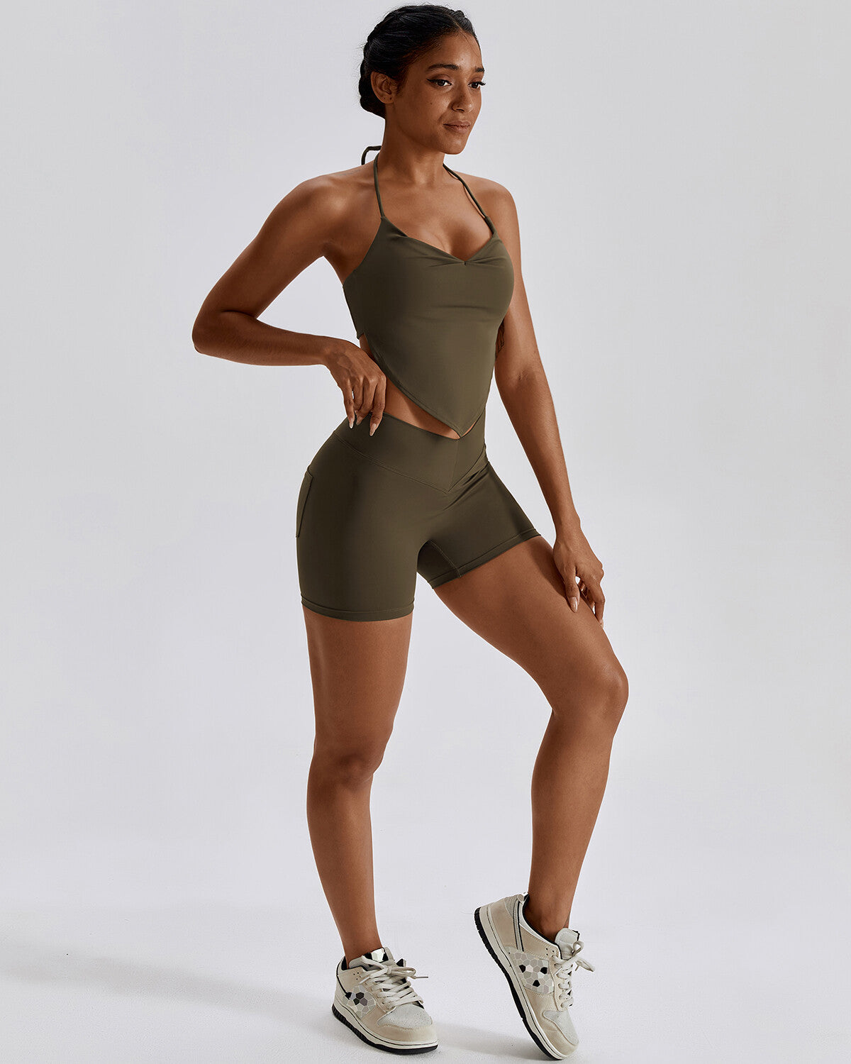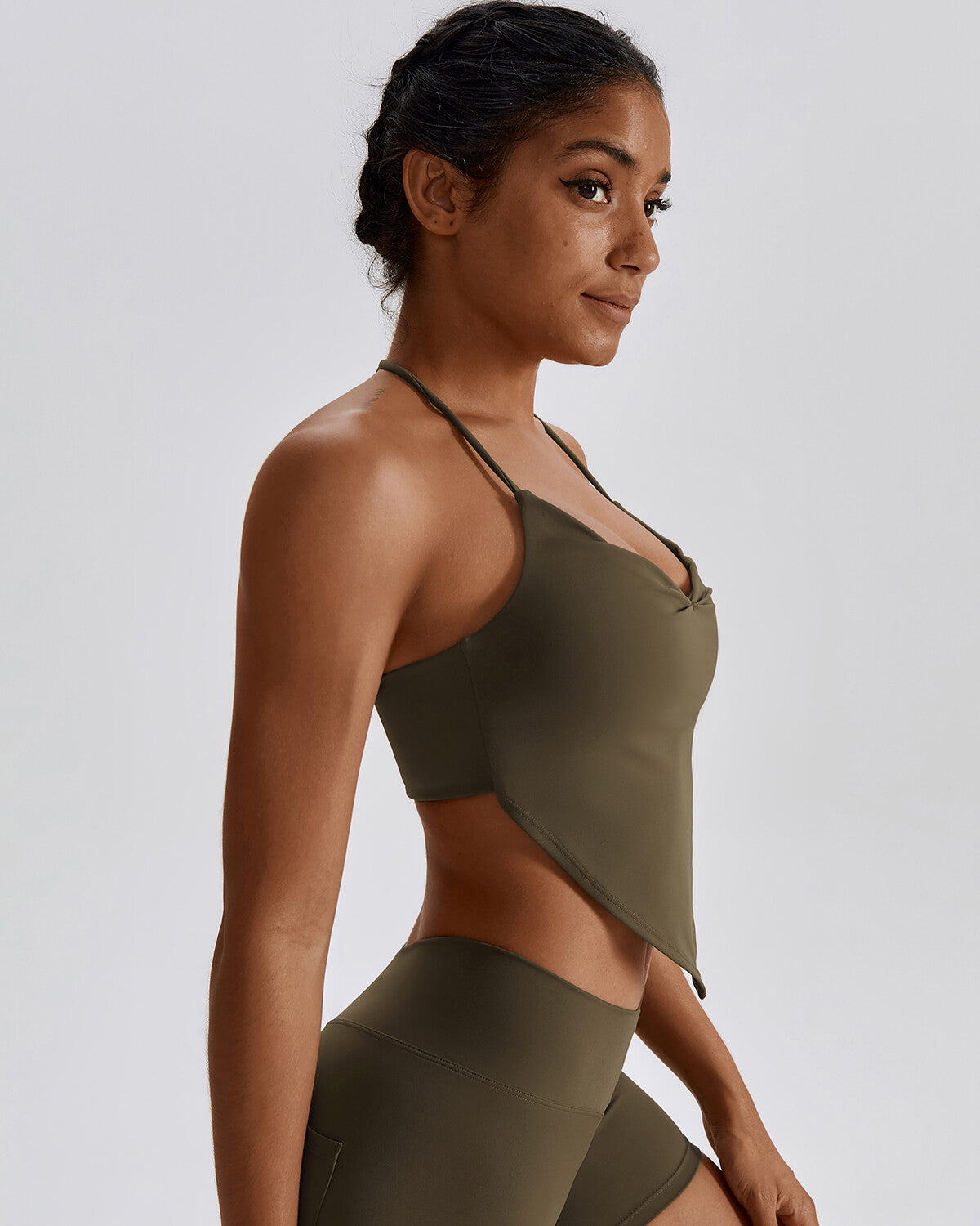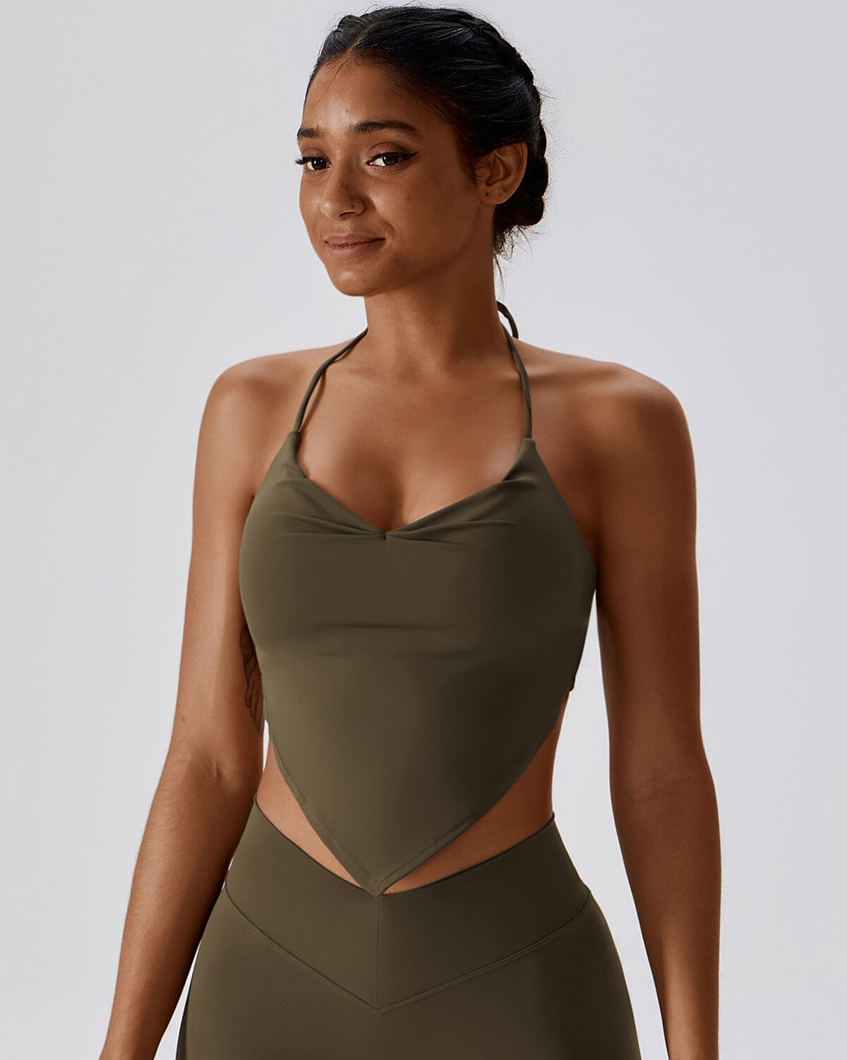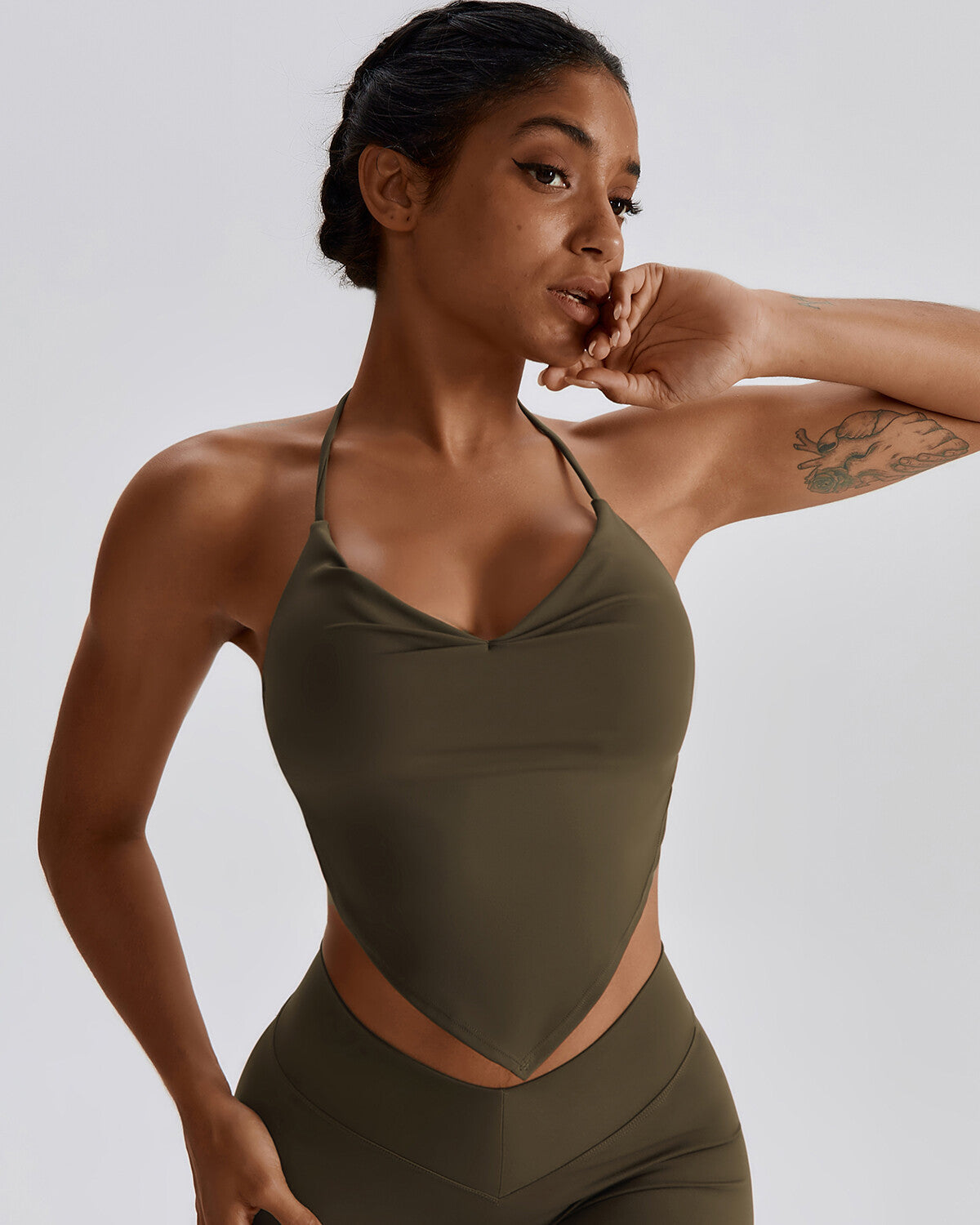 The tie neck, V-shaped neckline, and backless design radiate allure, complemented by the secure elasticated hem. Ideal for sports, yoga, and running, this tank top enhances your silhouette with an inverted triangle scarf hem and collarbone-accentuating halter neck.