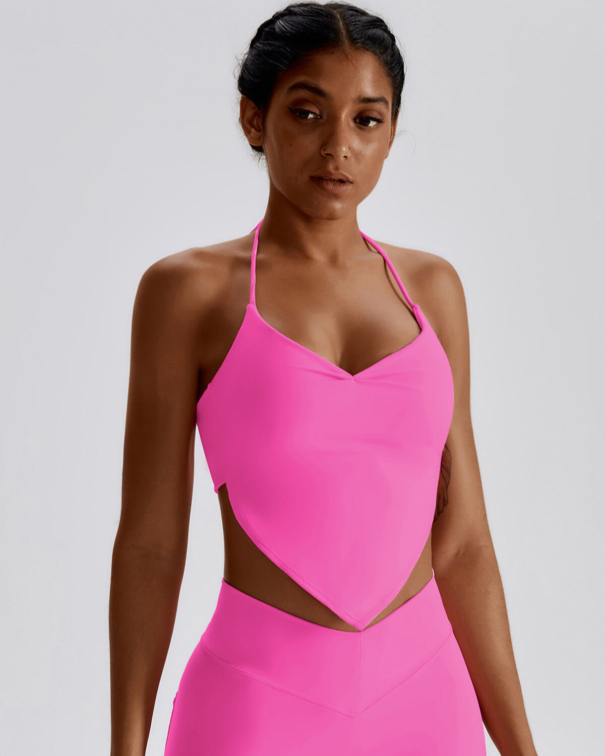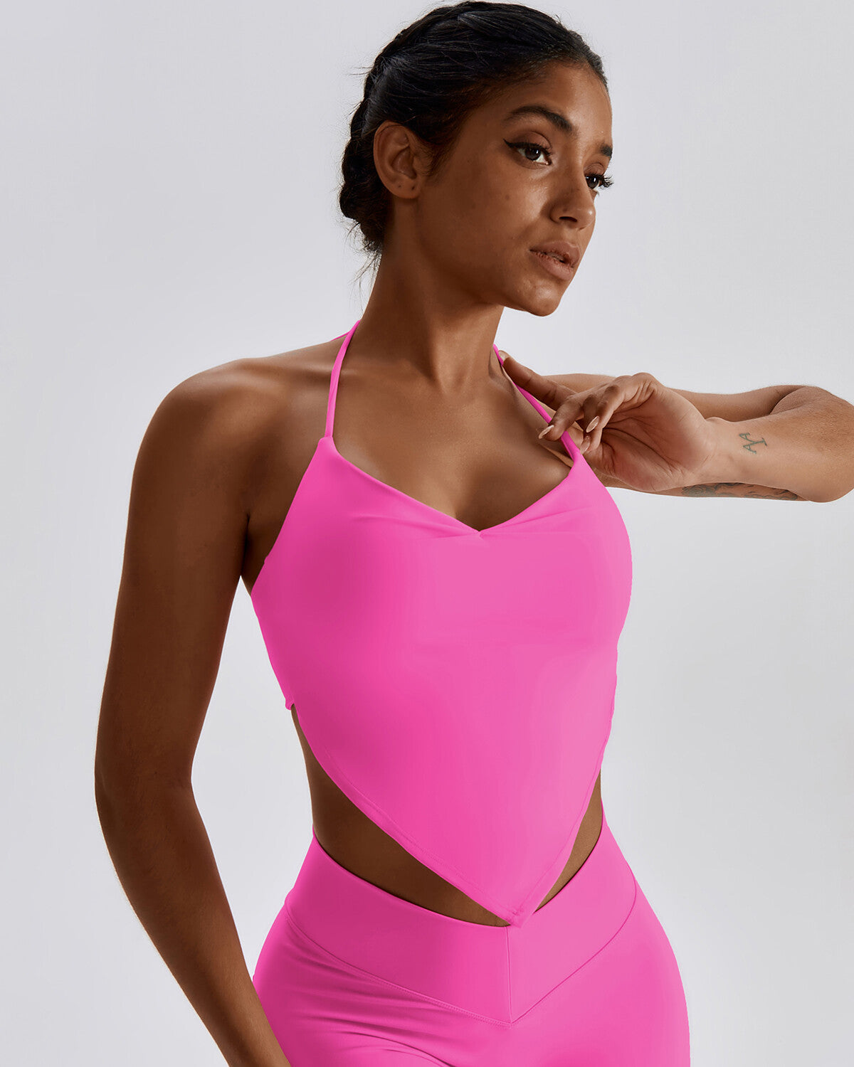 The tie neck, V-shaped neckline, and backless design radiate allure, complemented by the secure elasticated hem. Ideal for sports, yoga, and running, this tank top enhances your silhouette with an inverted triangle scarf hem and collarbone-accentuating halter neck.