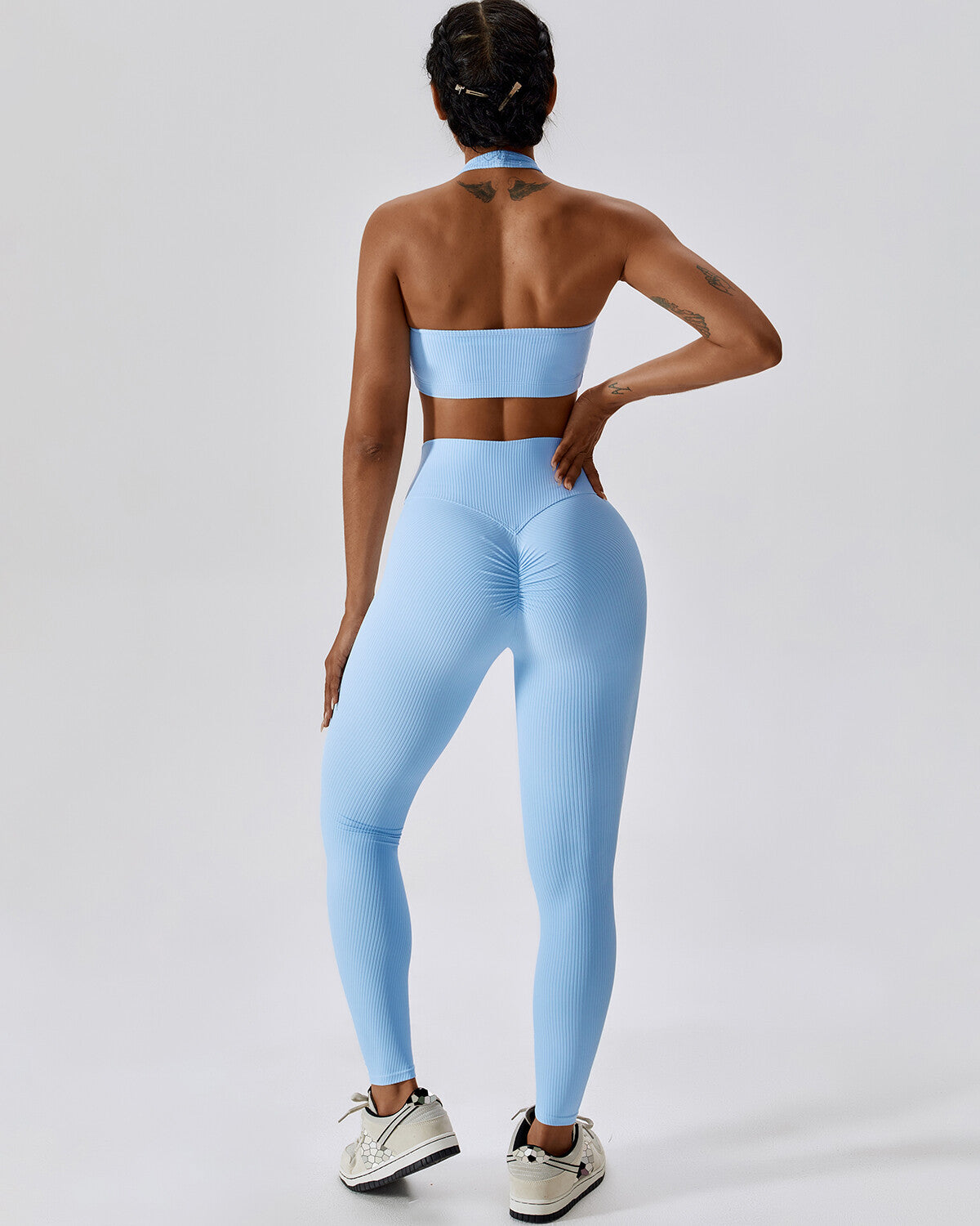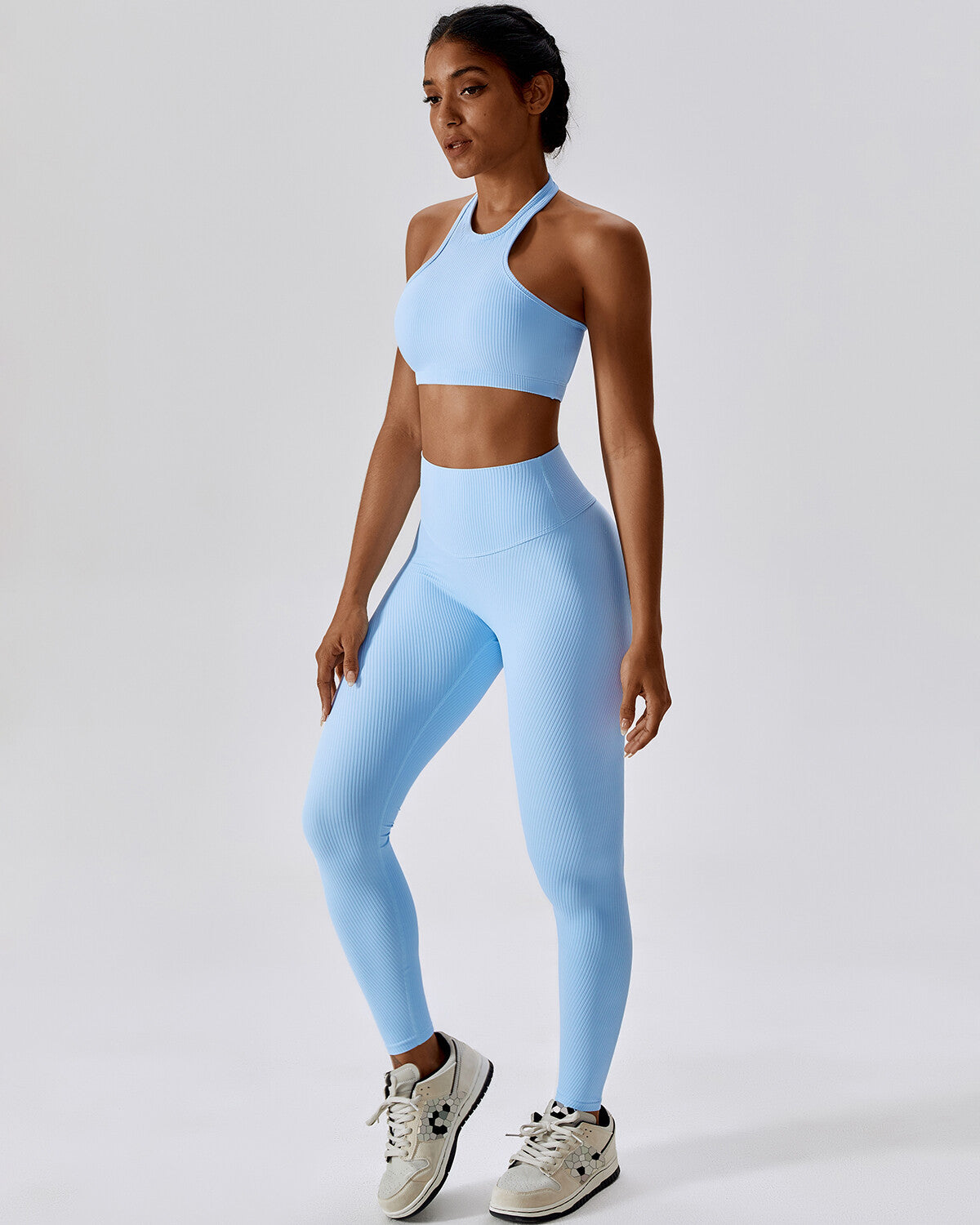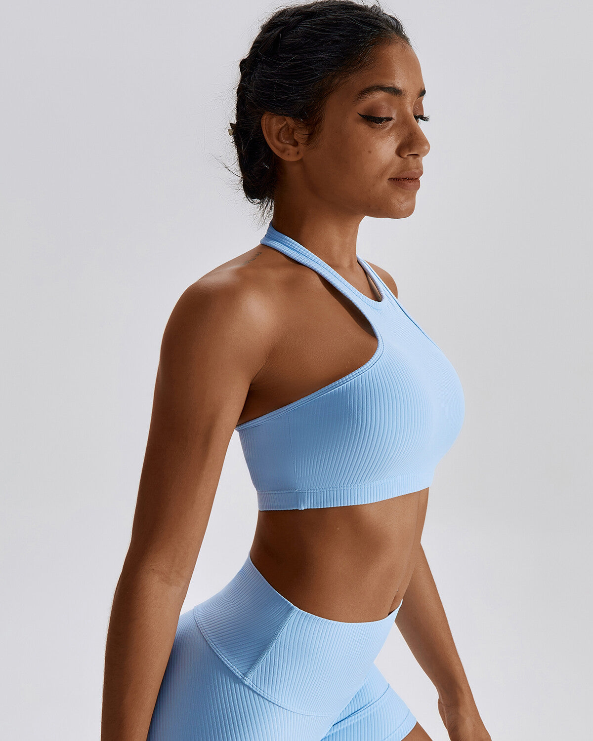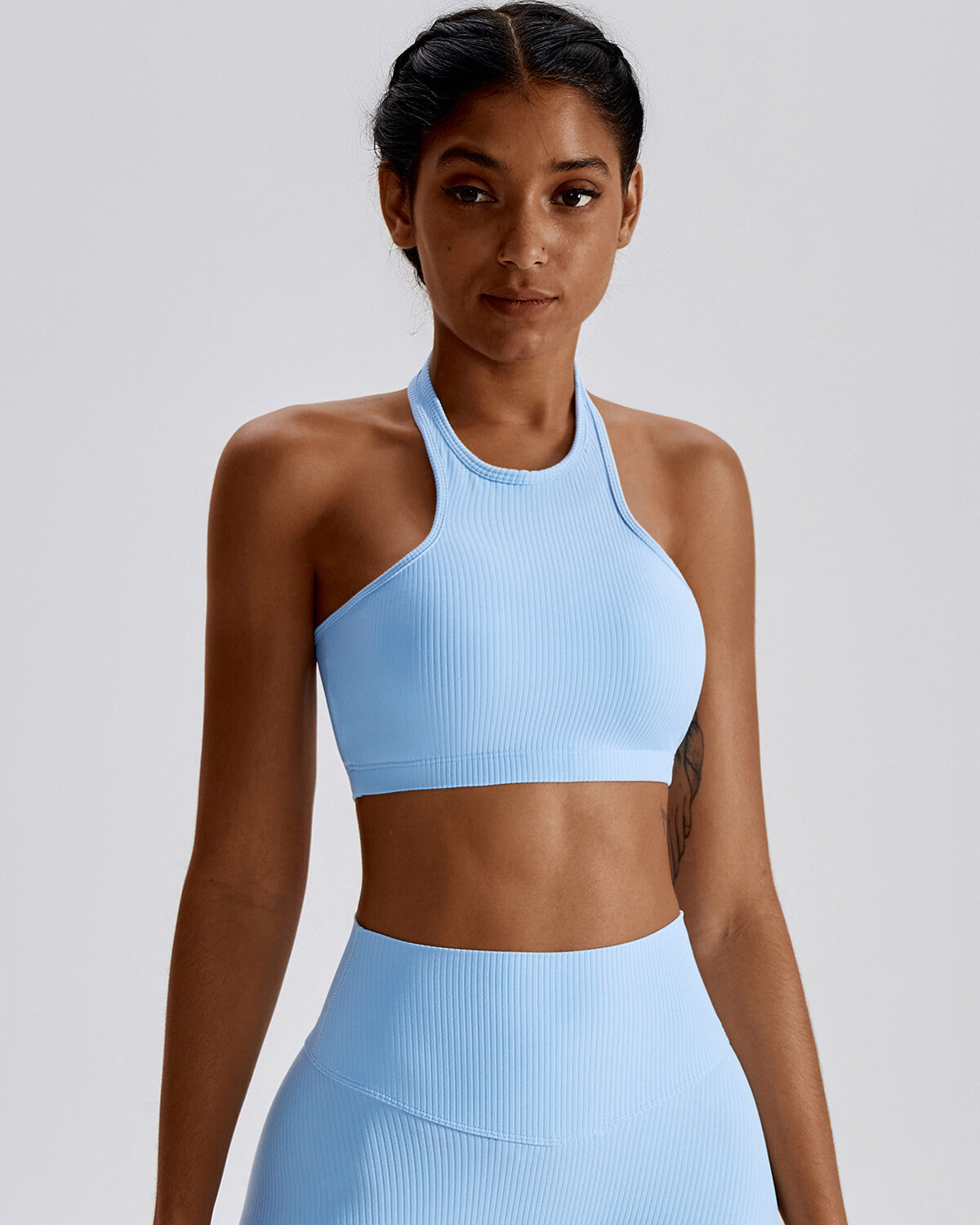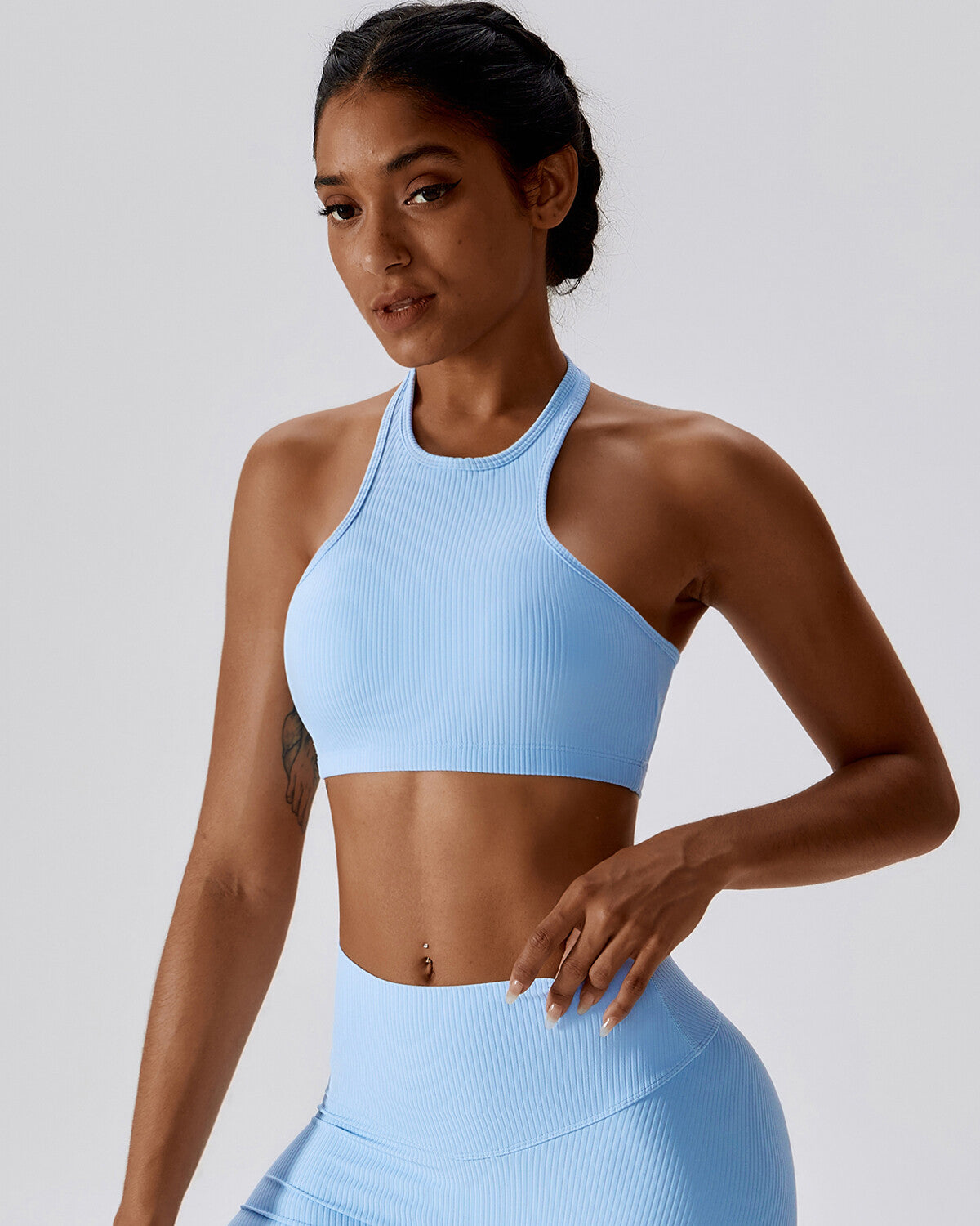 Introducing the Erin Sports Bra, where style and functionality seamlessly merge. Its halter neck, round neckline, and open back design make a bold statement, while the ribbed fabric offers modest compression for superior comfort during workouts.