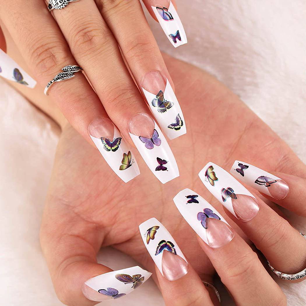 Press On Nails White Glossy French Coffin Butterfly Nail Kit