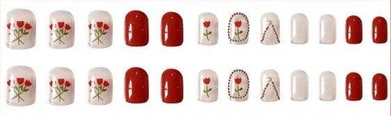 Red Press On Nails Flower Glossy Coffin Crystal Nail Kit